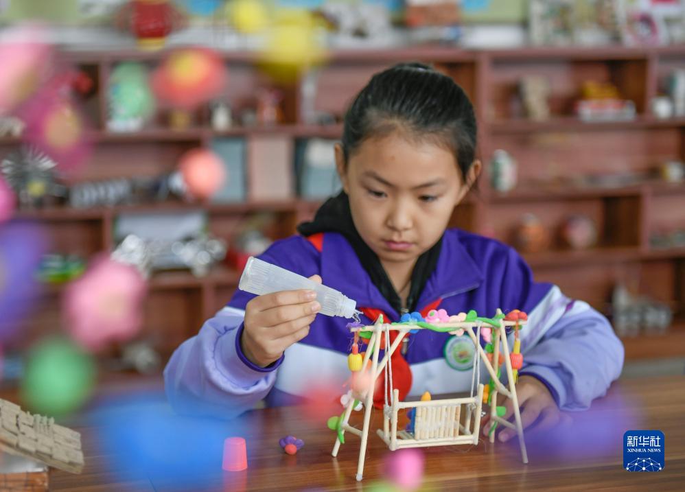 10月31日,河北省遵化市东旧寨镇梁屯中心小学的学生利用废弃物品做饰品。