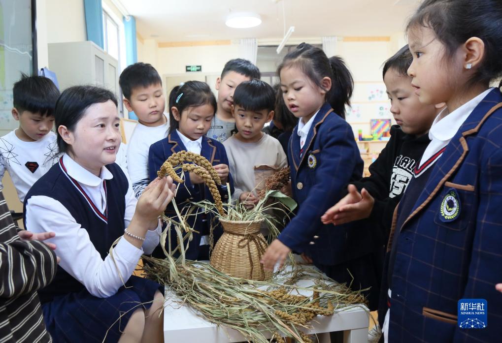 10月31日,河南省洛阳市汝阳县新华园幼儿园老师教小朋友们识别谷子,提醒大家珍惜粮食。
