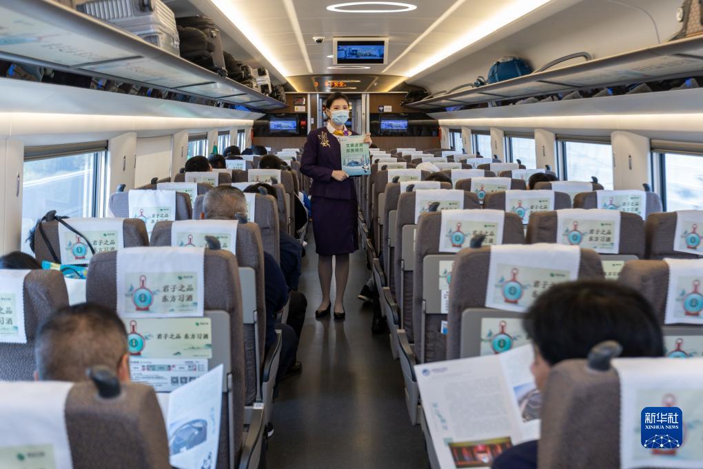 10月31日,乘务员向旅客介绍进博会亮点。