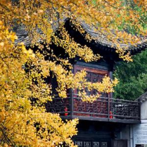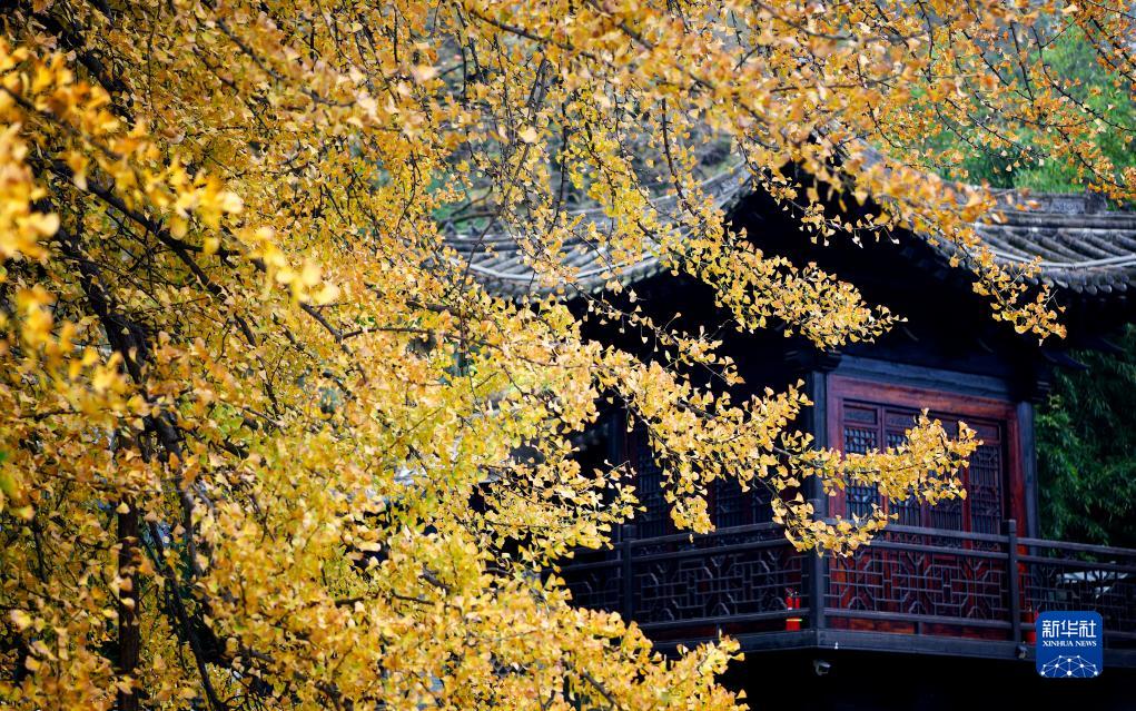 深秋时节,陕西省西安市长安区终南山古观音禅寺内的千年银杏满目金黄,吸引游客参观游览。