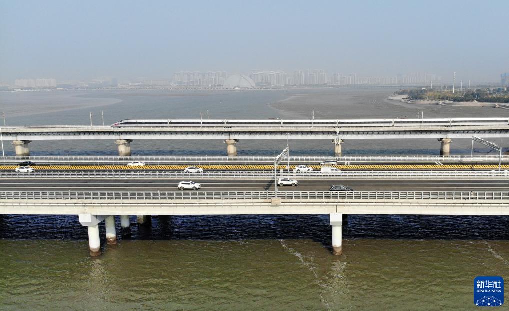 车辆从青兰高速女姑口跨海特大桥(前)上驶过(10月31日摄,无人机照片)。