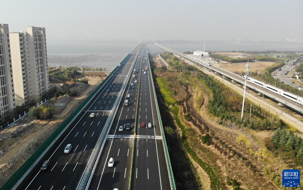 车辆行驶在青兰高速全线起点双埠收费站附近(10月31日摄,无人机照片)。