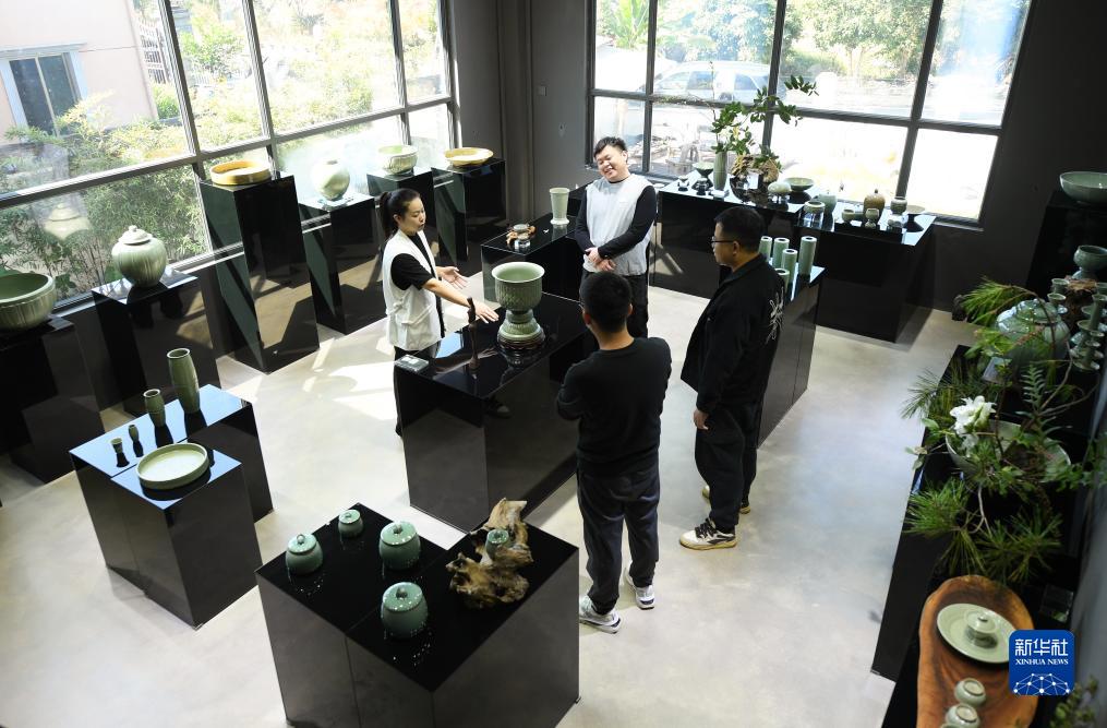 “95后”陶瓷夫妻档季双俊和季资美是高中和大学时的同学,因为共同的兴趣走到一起。从景德镇陶瓷工艺美院毕业后回到故乡龙泉,夫妻二人在瓯江旁的炉田村驻扎下来,成立了“梅夫人”工作室,潜心钻研北宋风格的青瓷器。两人从古瓷中寻找灵感,力图重现北宋龙泉窑的胎釉特点,并借鉴青铜器、金银器、古代服装上的纹样,在瓷上倾注对传统文化的热爱。