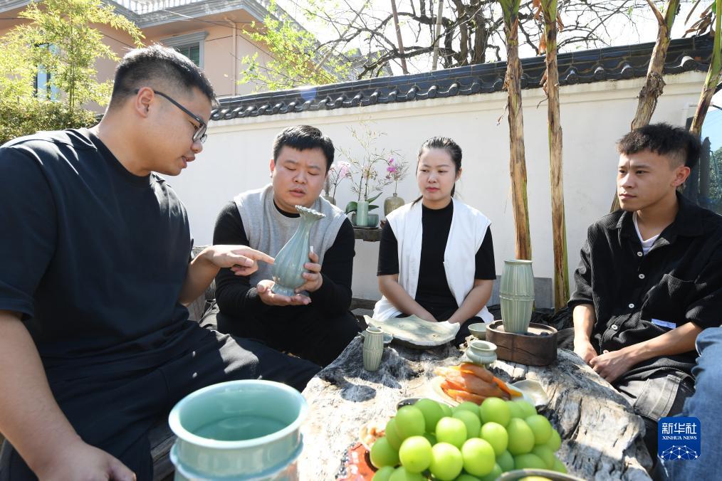 “95后”陶瓷夫妻档季双俊和季资美是高中和大学时的同学,因为共同的兴趣走到一起。从景德镇陶瓷工艺美院毕业后回到故乡龙泉,夫妻二人在瓯江旁的炉田村驻扎下来,成立了“梅夫人”工作室,潜心钻研北宋风格的青瓷器。两人从古瓷中寻找灵感,力图重现北宋龙泉窑的胎釉特点,并借鉴青铜器、金银器、古代服装上的纹样,在瓷上倾注对传统文化的热爱。