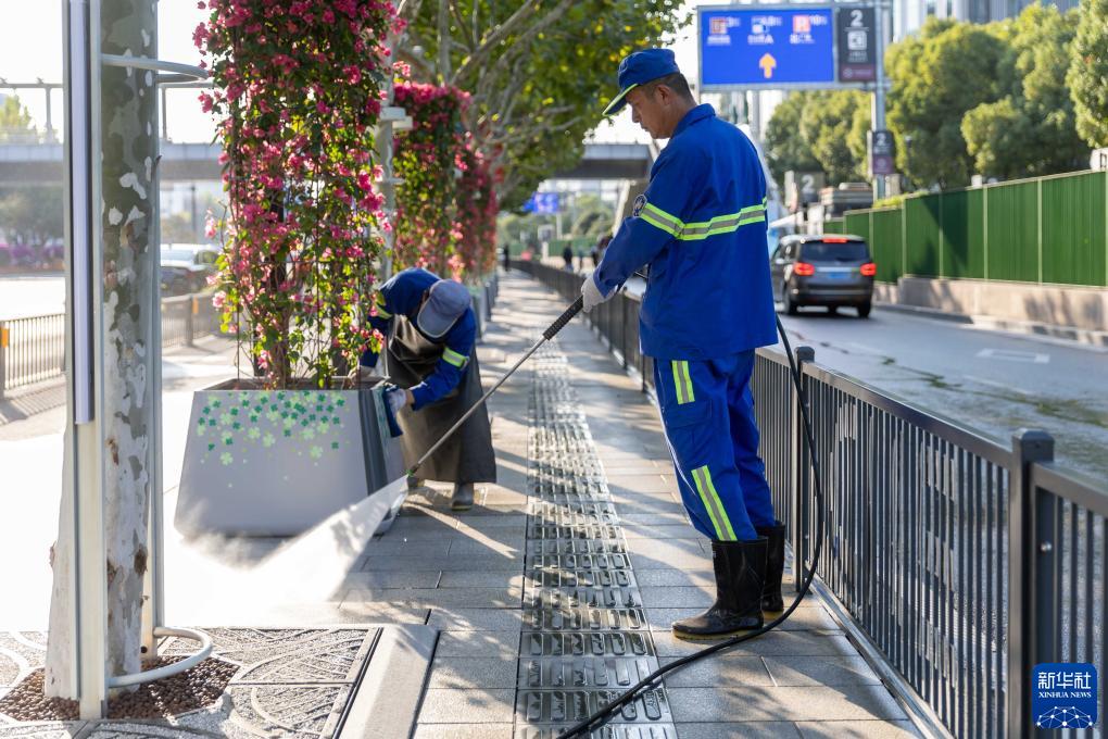 10月31日,环卫工人在场馆周边进行清洁工作。