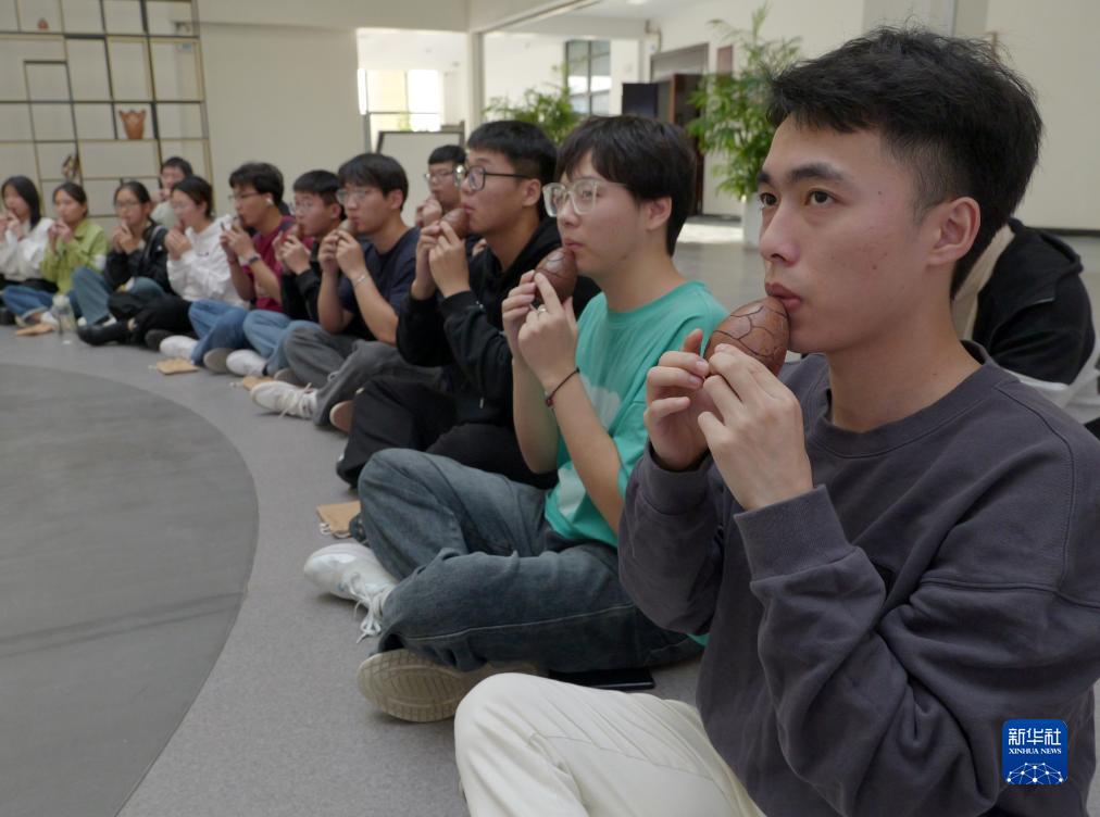 10月31日,在河南省武陟县黄河交通学院黄河文化馆内,学生在练习吹奏黄河泥埙。