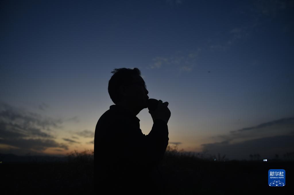 10月31日黄昏时分,王建在河南省武陟县黄河岸边吹奏黄河泥埙。