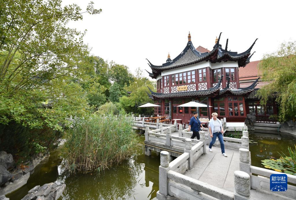 9月28日,人们行走在德国汉堡豫园九曲桥上。