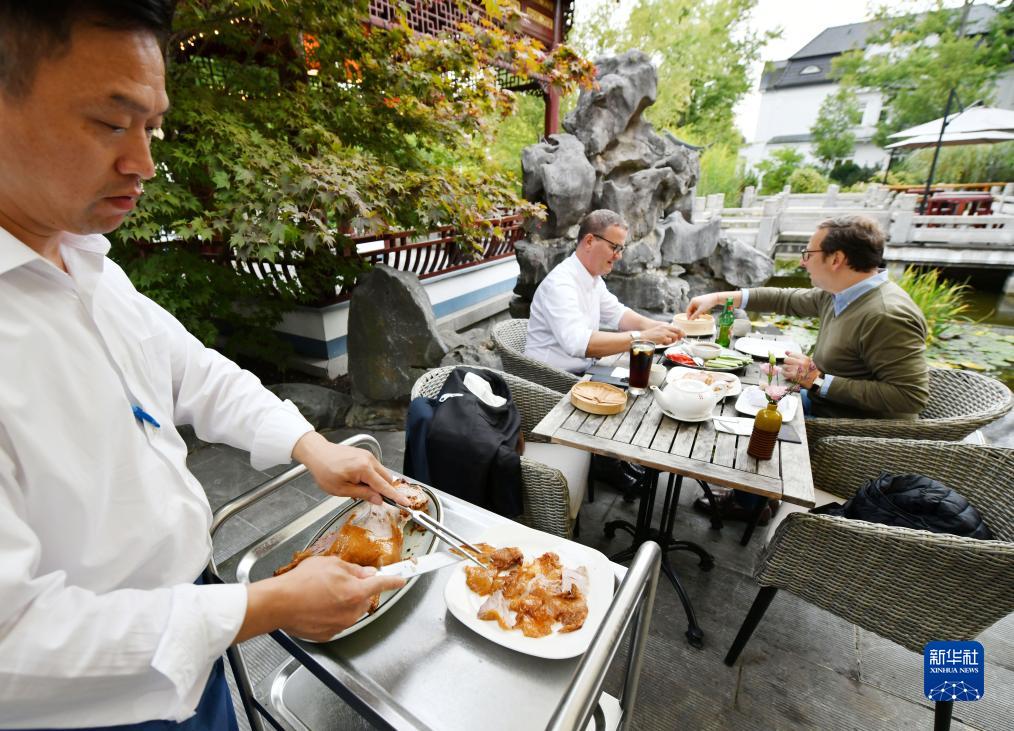 9月28日,德国汉堡豫园餐厅工作人员为顾客片烤鸭。