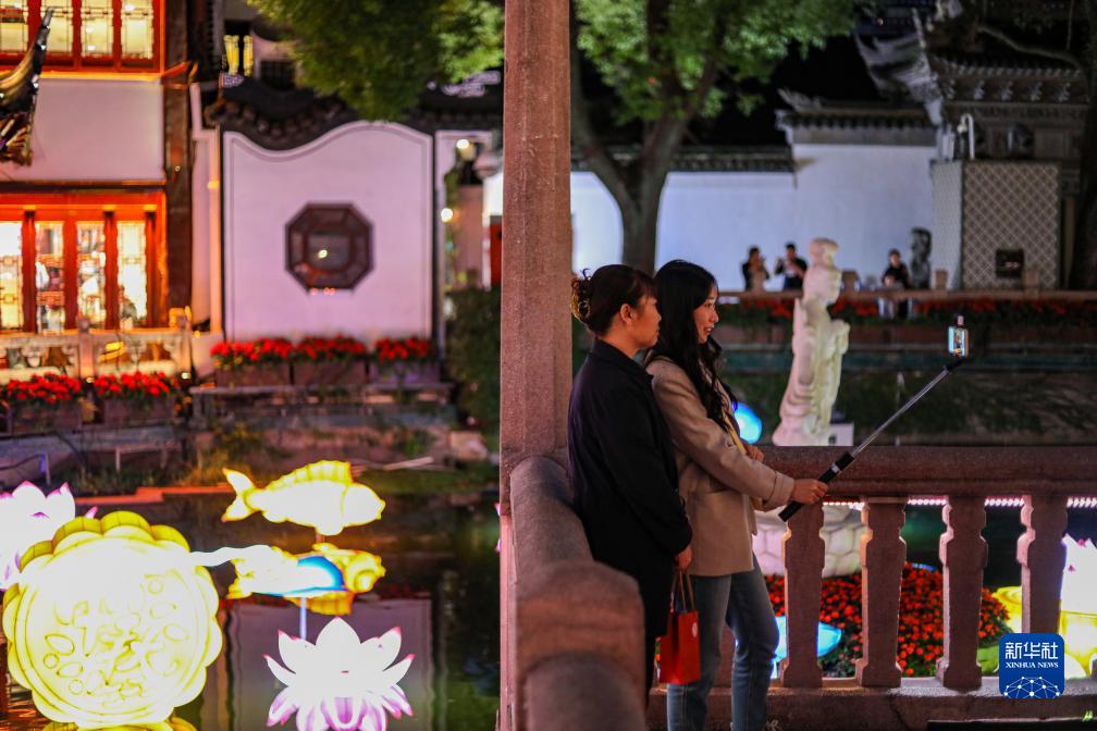 10月11日,游客在上海豫园的湖心亭拍照留念。