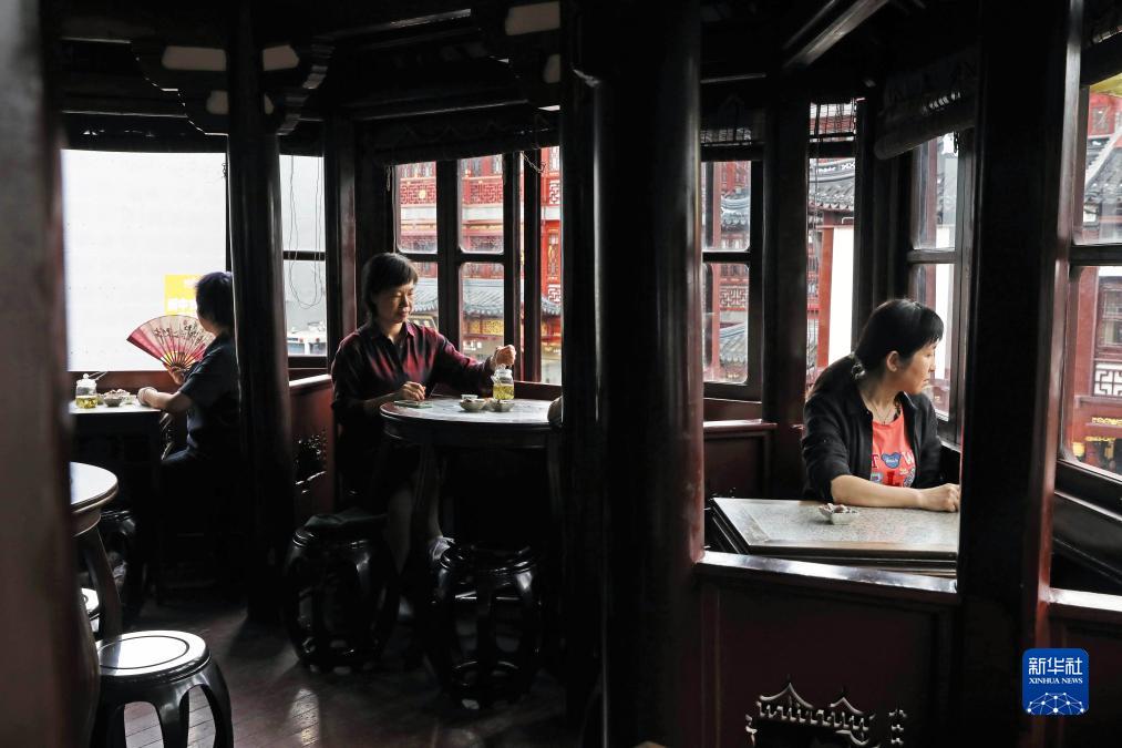 10月12日,人们在上海豫园的九曲桥湖心亭茶楼喝茶。湖心亭茶楼是上海现存最古老的茶楼。