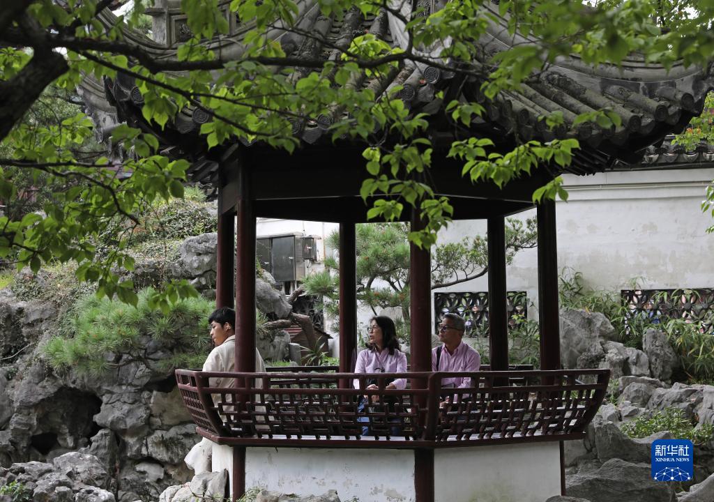 10月12日,人们在上海豫园的亭子中休息。