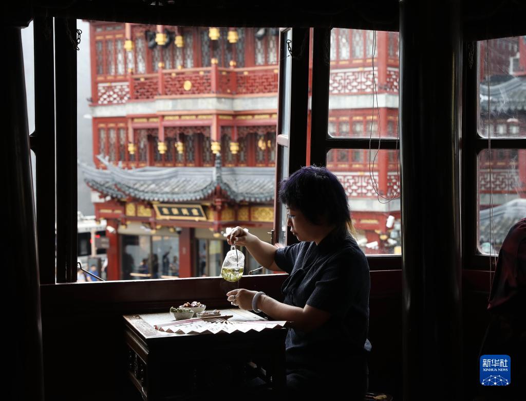 10月12日,人们在上海豫园九曲桥湖心亭茶楼喝茶。湖心亭茶楼是上海现存最古老的茶楼。