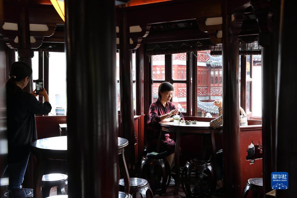 10月12日,人们在上海豫园九曲桥湖心亭茶楼喝茶。湖心亭茶楼是上海现存最古老的茶楼。