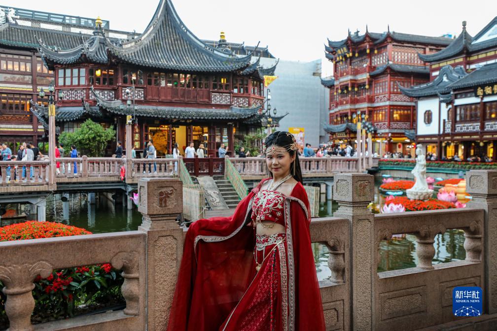 10月11日,游客在上海豫园湖心亭拍照留念。