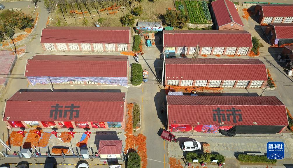 11月1日,在山东省潍坊市临朐县五井镇,村民在晾晒柿子(无人机照片)。