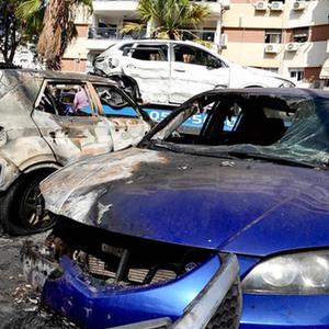 这是11月1日在以色列南部城市阿什杜德拍摄的遭火箭弹袭击后损毁的车辆。