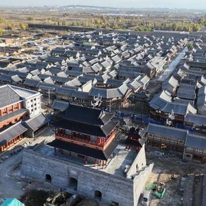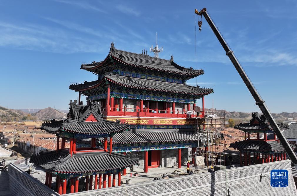 11月1日,工人在河北省张家口市万全右卫城长城国家文化公园文旅融合区项目建设工地施工(无人机照片)。