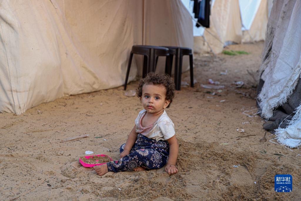 这是11月1日在加沙地带南部城市汗尤尼斯一处临时难民营地拍摄的流离失所的儿童。