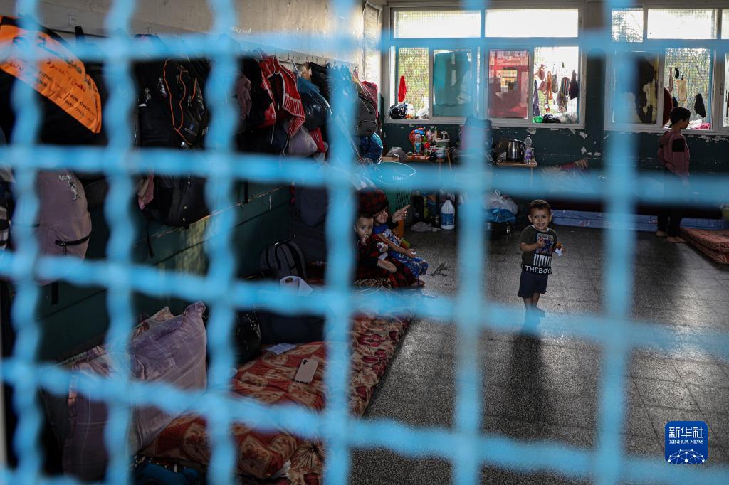 这是11月1日在加沙地带南部城市汗尤尼斯一处临时难民营地拍摄的流离失所的儿童。
