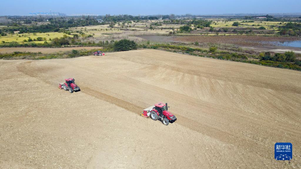 11月2日,在合肥市蜀山区小庙镇,农民驾驶农机在田间播种小麦(无人机照片)。