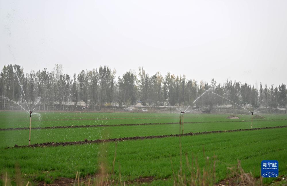 11月2日在天津市西青区辛口镇当城村拍摄的一处正在进行喷灌的农田。