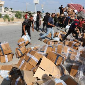 11月2日,在加沙地带南部,人们从卡车上卸下人道救援物资。