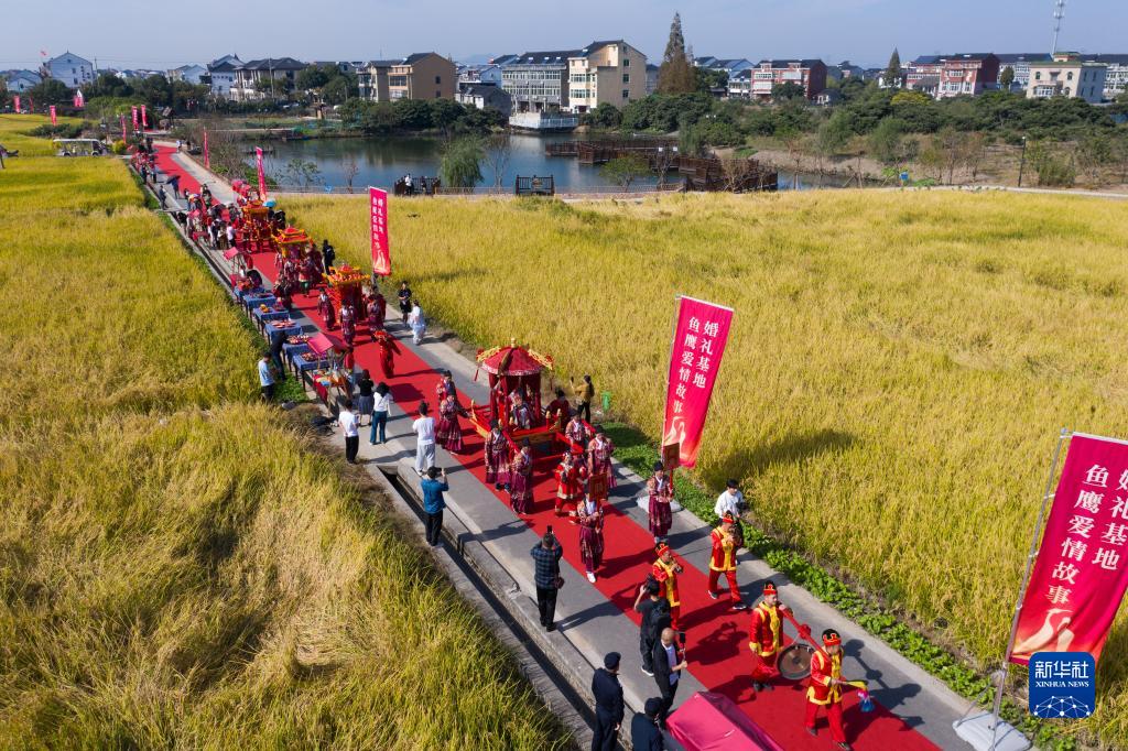 坐上大花轿、走过合欢桥、跨过红火缸、同乘幸福船……11月3日,一场“良缘水乡缔 佳偶自天成”水乡集体婚礼在浙江省杭州市临平区塘栖镇丁河村新建成的“丁山湖鱼鹰爱情故事婚礼基地”举行。八对新人在村民和游客的见证下喜结良缘,并发出《婚俗改革倡议书》,向广大适婚青年传播新时代的婚恋观,倡导健康文明的嫁娶新风尚。该婚礼基地依托水乡风貌,已成为当地特色乡村文旅品牌。