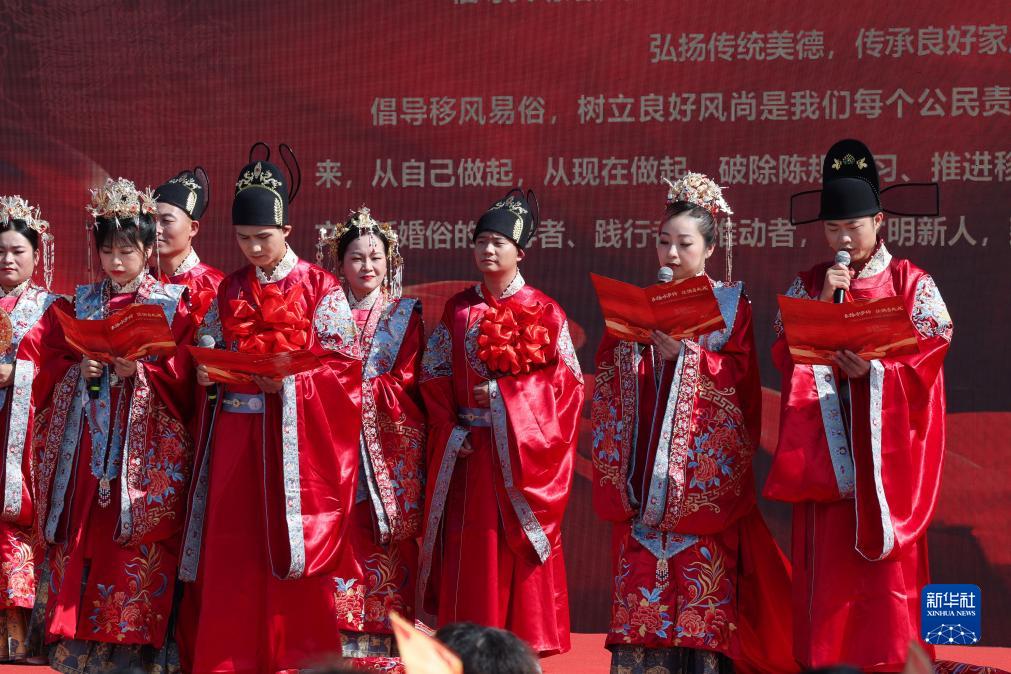 11月3日,参加集体婚礼的新人们宣读《婚俗改革倡议书》,发出推进移风易俗、婚俗改革的倡议。