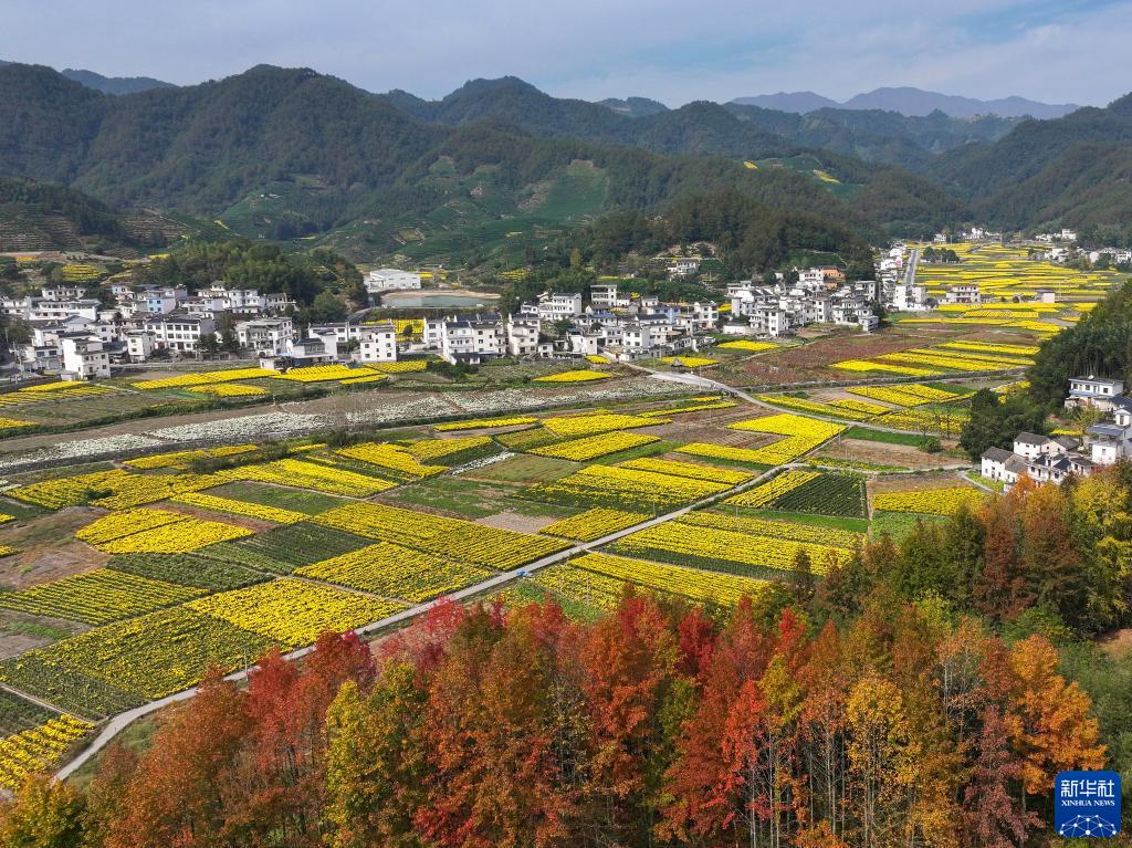 11月3日在安徽省黄山市歙县溪头镇桃源村拍摄的菊花田(无人机照片)。