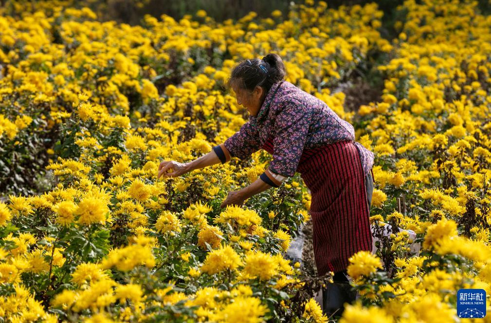 10月29日,村民在重庆市南川区黎香湖镇东湖村中药材基地里采摘金丝皇菊。