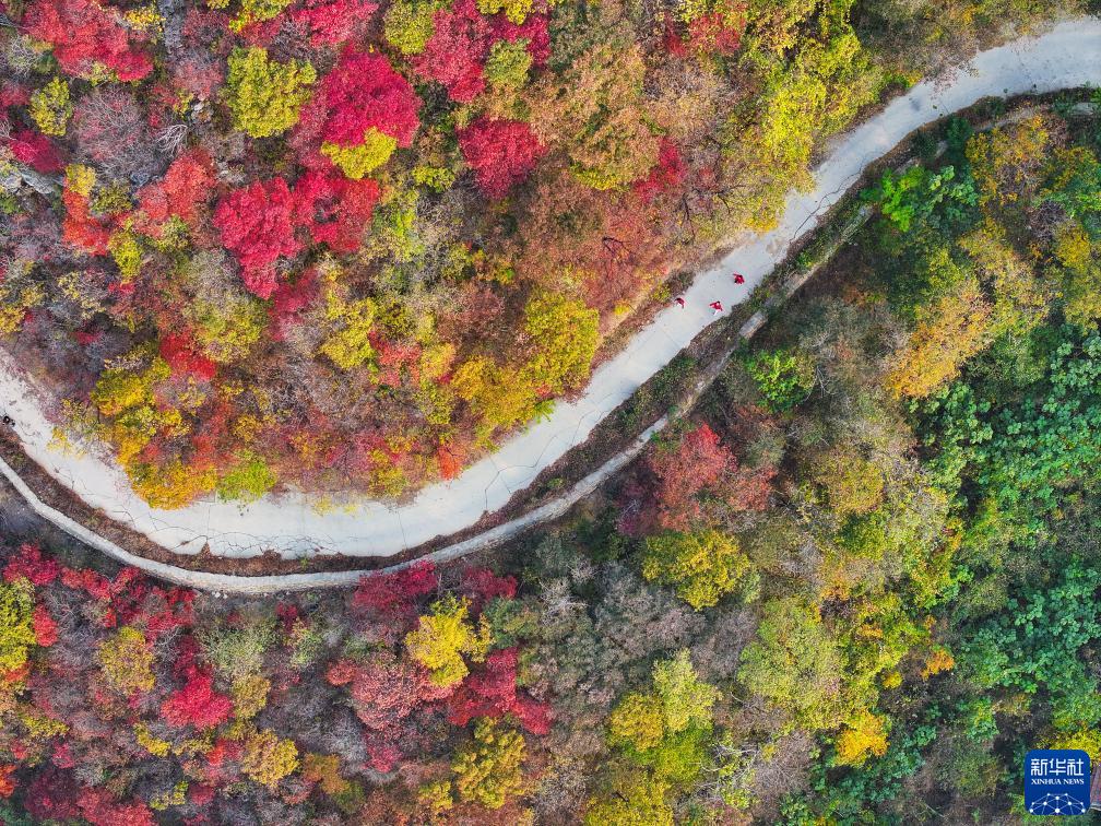 10月29日,游客在山东省淄博市博山区红叶柿岩景区游览(无人机照片)。