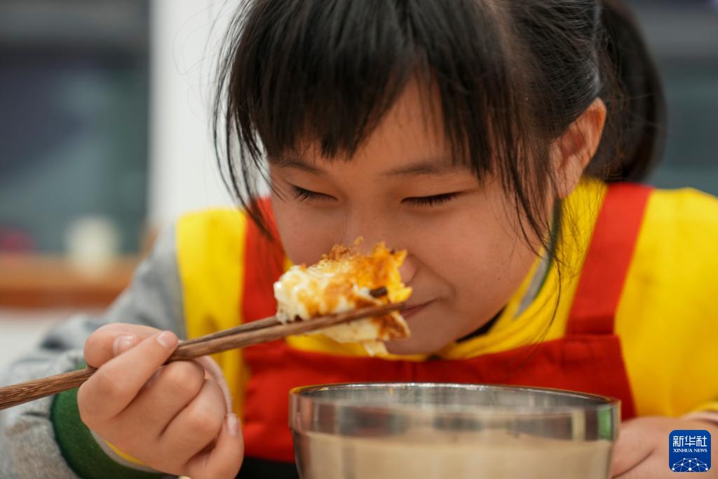 10月30日,在重庆市特殊教育中心的劳动课教室内,一名三年级的视力障碍学生夹起自己煎好的鸡蛋。