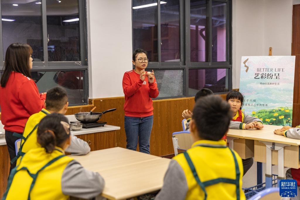 10月30日,在重庆市特殊教育中心,老师在劳动课教室教三年级的视力障碍学生煎鸡蛋。