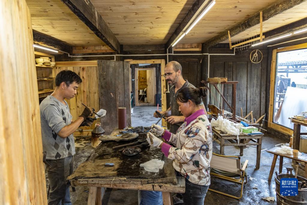 在重庆市城口县北屏乡松柏村,文森(中)在工作室内指导徒弟郑永平(左)、和求花对艺术作品进行前期的裱布工作(5月29日摄)。