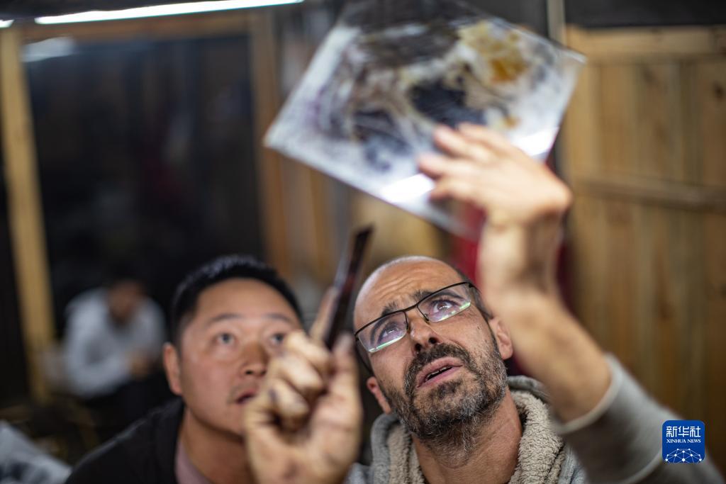 9月20日,在重庆市城口县北屏乡松柏村,文森(右)在工作室内指导村支书邹昌举分辨黑漆制作中的状态。