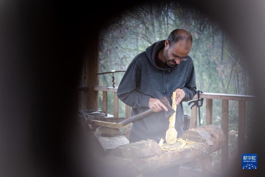 10月25日,在重庆市城口县北屏乡松柏村,文森在工作室外用取自漆树的木材制作漆勺。