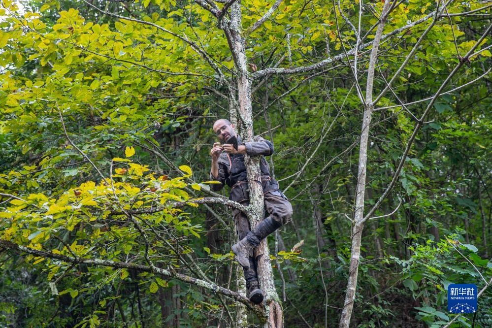 9月15日,在重庆市城口县北屏乡松柏村,文森在深山中的一棵漆树上将漆茧折成勺形,准备安放。