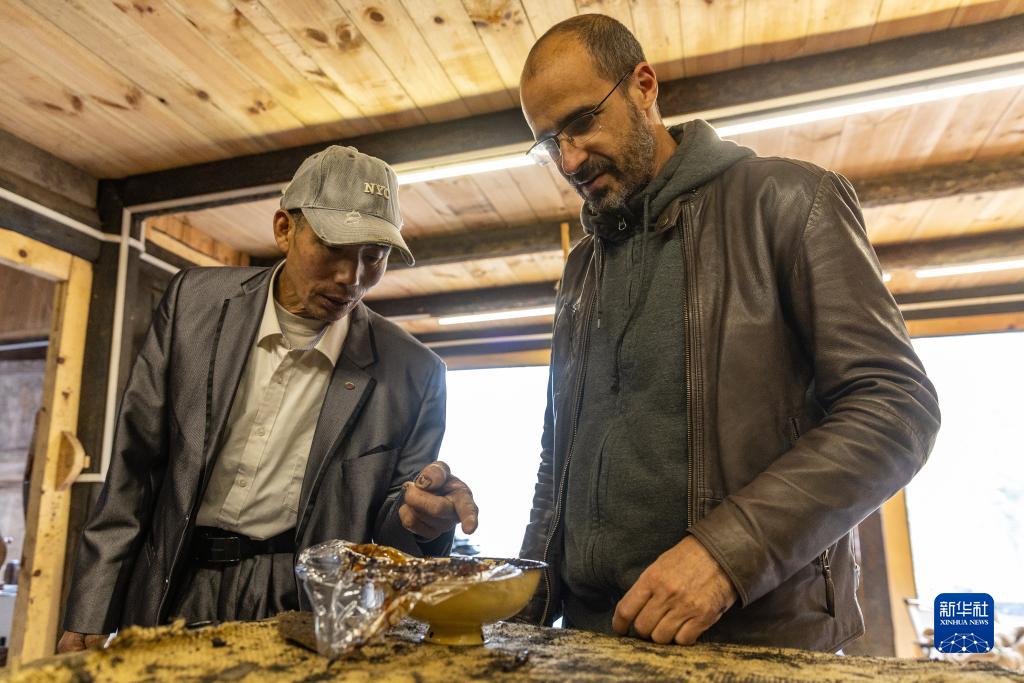 10月26日,在重庆市城口县北屏乡松柏村,文森(右)在工作室向他的师父割漆匠杨天伦展示今年割的漆。