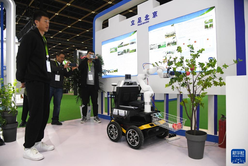 这是11月2日在世界农业科技博览会现场拍摄的一款智能采摘机器人。