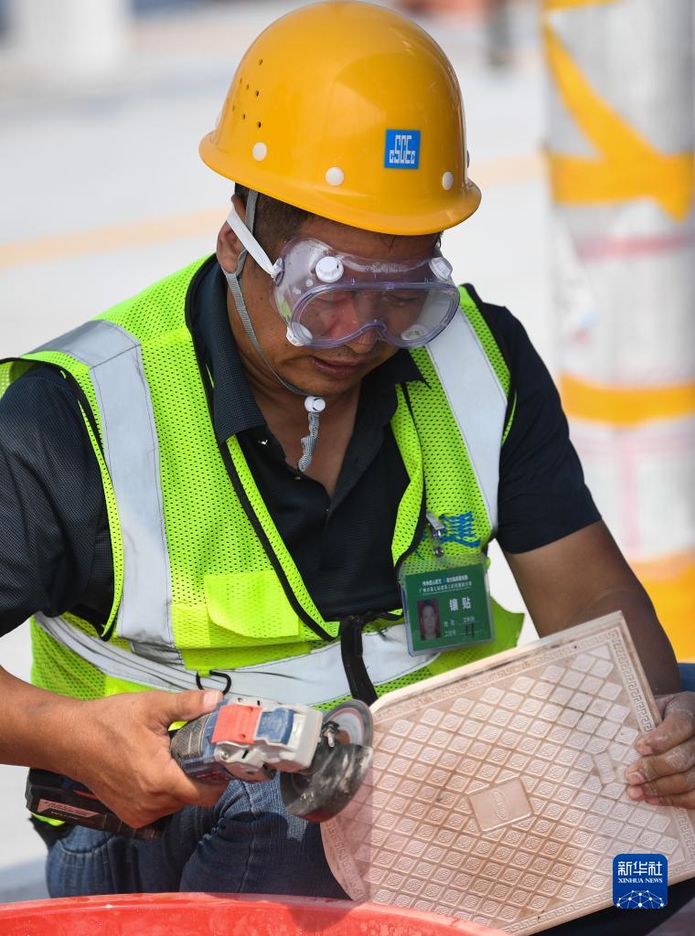 11月3日,参赛选手在镶贴项目中打磨瓷砖构件。