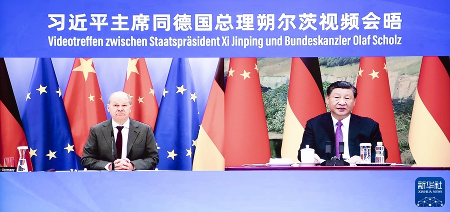 11月3日下午,国家主席习近平同德国总理朔尔茨举行视频会晤。新华社记者 李涛 摄