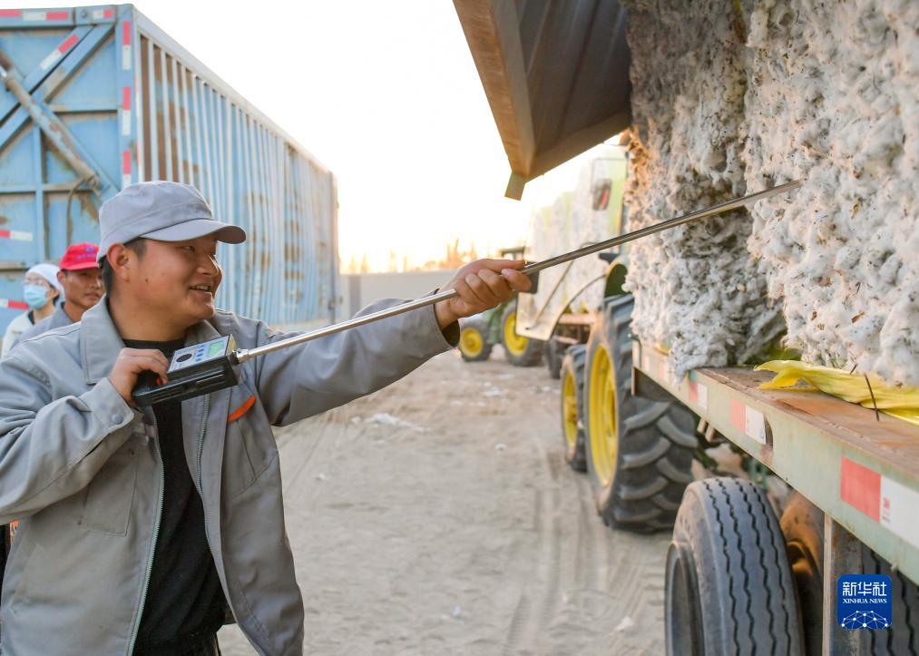 在新疆尉犁县,棉花加工厂工作人员在检测棉花的湿度(11月1日摄)。