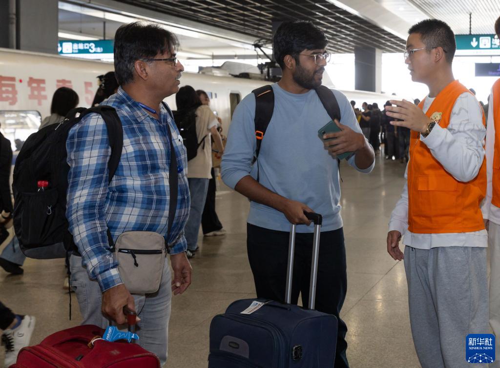 11月3日,进博志愿者为抵达上海虹桥火车站的外国旅客指引方向。