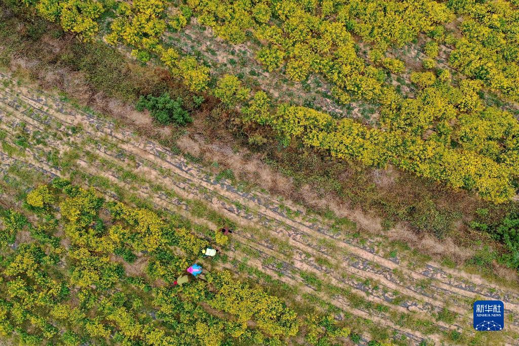 11月3日,村民在神秀谷田园综合体内收获菊花(无人机照片)。