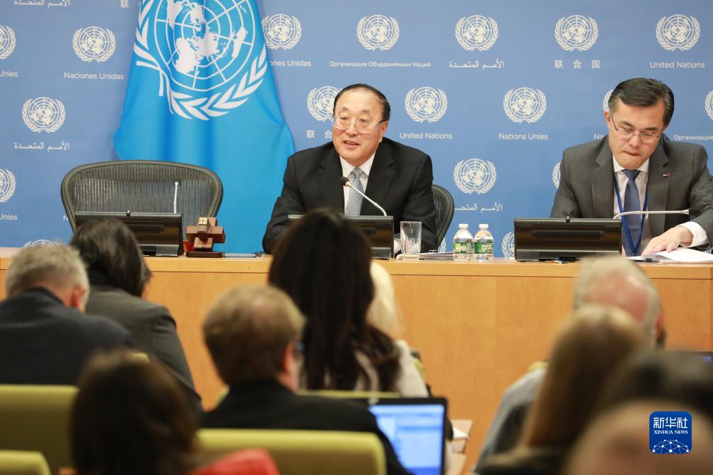 11月1日,在位于纽约的联合国总部,中国常驻联合国代表张军(左)在媒体吹风会上讲话。