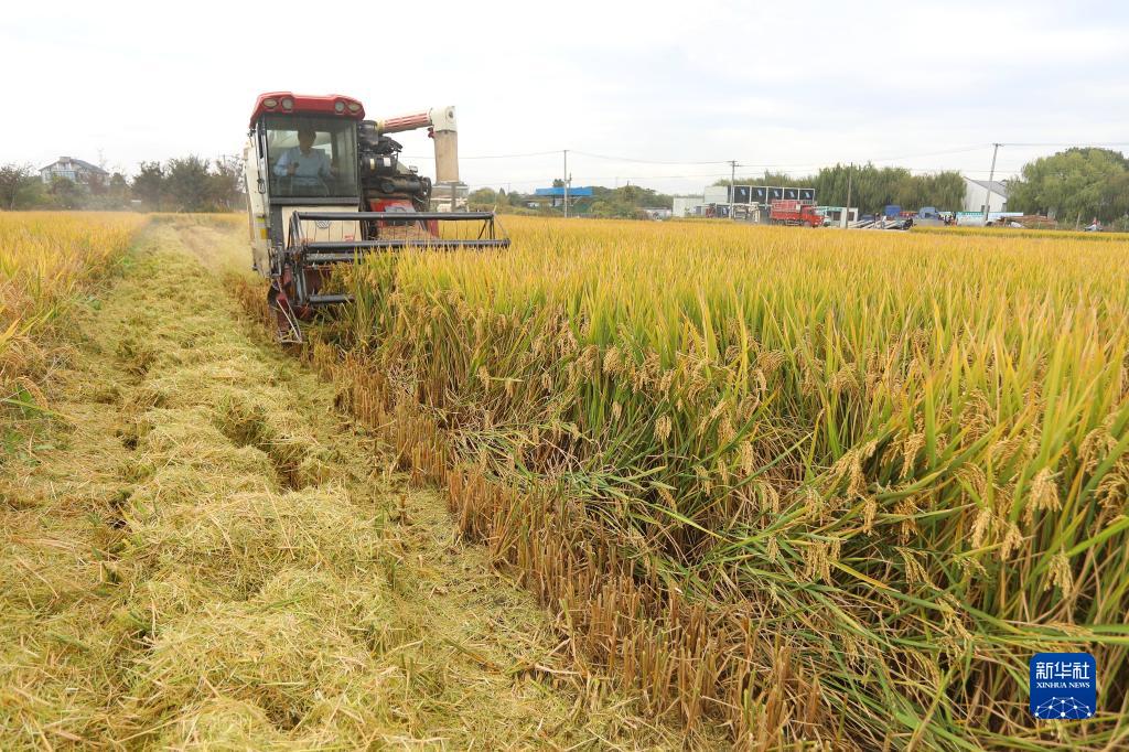 11月4日,在浙江省嘉兴市南湖区凤桥镇永红村,农机手驾驶收割机收割水稻。