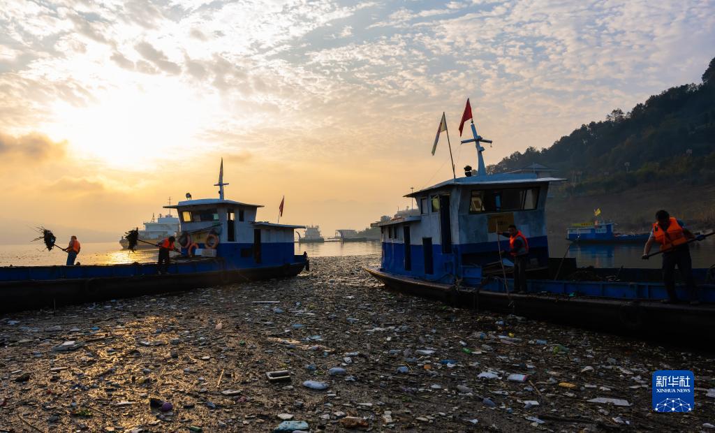 今年汛后三峡水库蓄水至175米水位以后,水库两岸消落带上的枯枝、秸秆、塑料等漂浮物聚集江面。位于三峡坝上库首的湖北省宜昌市秭归县积极组织清漂作业人员和机械作业船舶,进行全天候拦截清理,以确保三峡水库水质、船舶行驶和三峡枢纽运行安全。