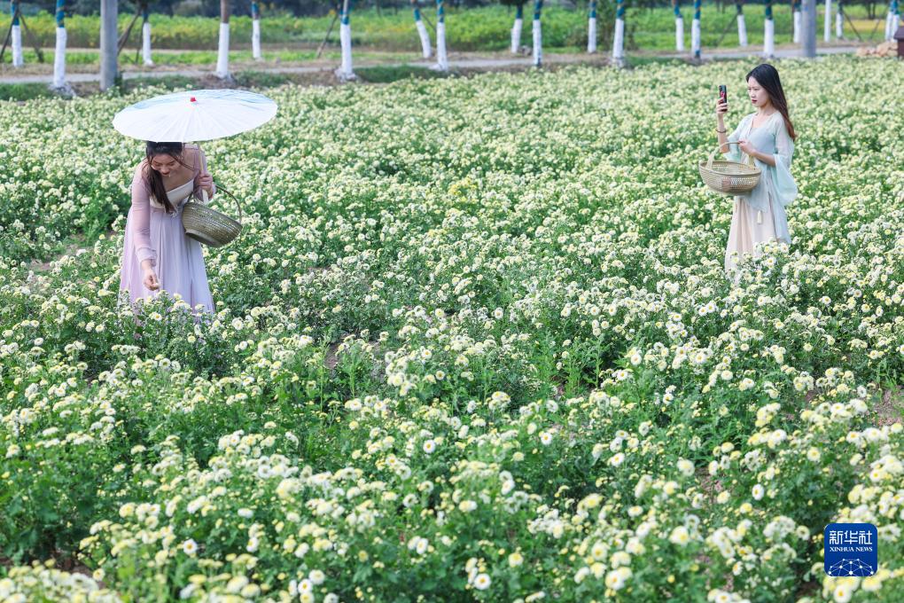 11月4日,游客在三村村的杭白菊基地里采摘拍照。