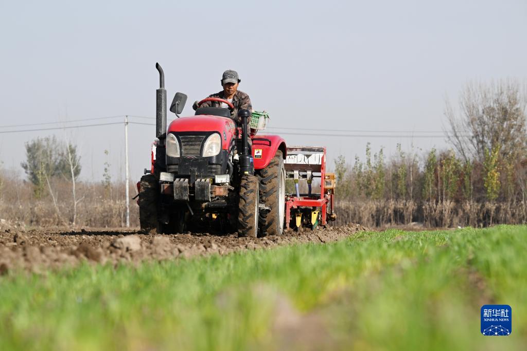 11月4日,天津市静海区台头镇农民操作农机播种小麦。